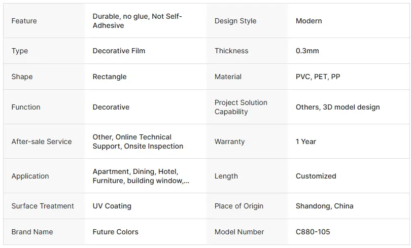 De modernen festen Faarf Blisterfilm ass en dekorativen Filmmaterial deen héich Molkolibele wéi d'Basismaterial benotzt. No der Faarwen a Beschichtungsbehandlung, et erreecht Adheten duerch den "Blisterprozess" (Vakuum Adsorption Meldding). Et fonctionnéiert "Ongformilitéit, staark Plastiksberëttel, an héich kaaischtektiounssektioun", an ass duerchfuer wéi wäit benotzt. Et ass eng vun den Allgemengen benotzte Material am modernen minimalistst Stil Design.